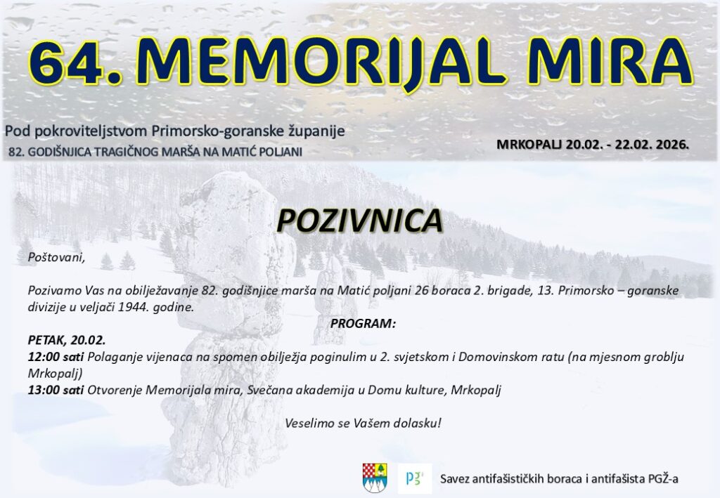 Pozivamo Vas na obilježavanje i svečanu akademiju koja će se održati 20. veljače (petak) 20266. godine u Mrkoplju. Prijaviti se možete najkasnije do 17. veljače 2026. do 10 sati.