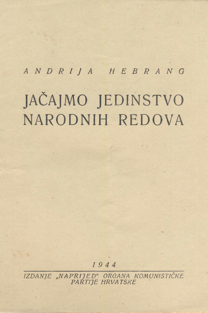 Brošura: ANDRIJA HEBRANG: JAČAJMO JEDNISTVO/NARODNIH REDOVA, 1944. IZDANJE „NAPRIJED“ ORGANA KOMUNISTIČKE PARTIJE HRVATSKE (članci)