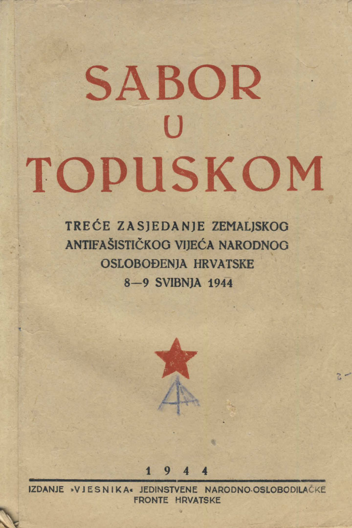 Brošura: SABOR/U/TOPUSKOM/TREĆE ZASJEDANJE ZEMALJSKOG/ANTIFAŠISTIČKOG VIJEĆA NARODNOG/OSLOBOĐENJA HRVATSKE/8.-9. SVIBNJA 1944./1944/IZDANJE „VJESNIKA“ JEDINSTVENE NARODNO-OSLOBODILAČEKE/FRONTE HRVATSKE